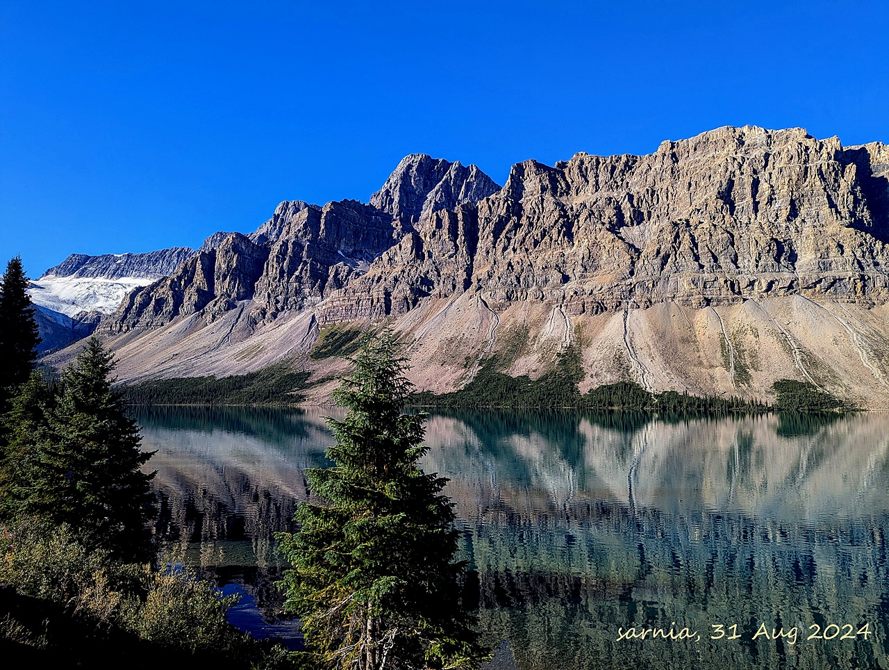 바람이 잔잔한 날 이른 오전, 빙하암석가루가 바닥으로 침전하면 컬러링 현상대신 미러링(산이 호수에 거울처럼 비치는 현상) 현상을 볼 수 있다.